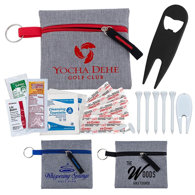 This Zippered pack contains: 1 Black Duo Metal Divot Tool/Bottle Opener,? 4 Standard Size Latex Free Bandages,? 2 Antiseptic Towelette,? 1 Antibacterial Hand Sanitizer,? 1 Sunscreen SPF30 Lotion,? 1 Lip Balm, 1 Golf Kit - 1 Divot Tool, 5 Golf Tees & 1 Ball Marker?.