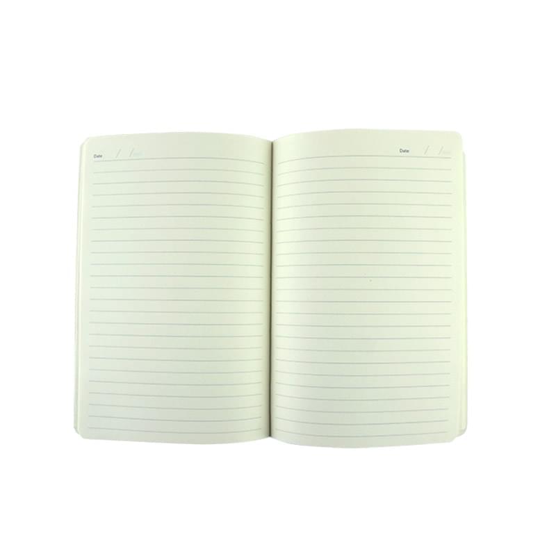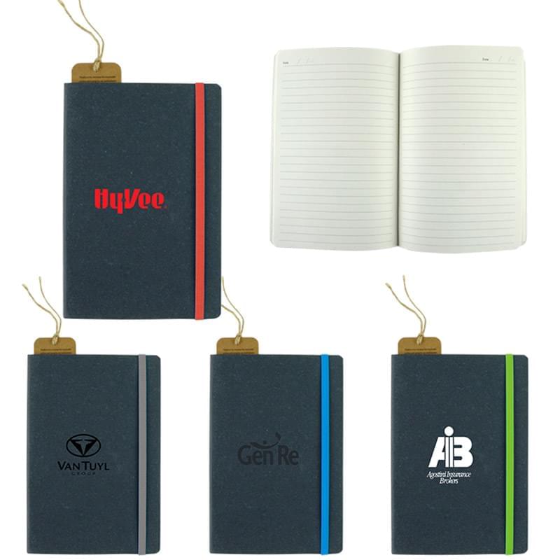 Perfect bound 80-sheet lined notebook with a recycled bonded leather cover and a color elastic band. Recycled paper.