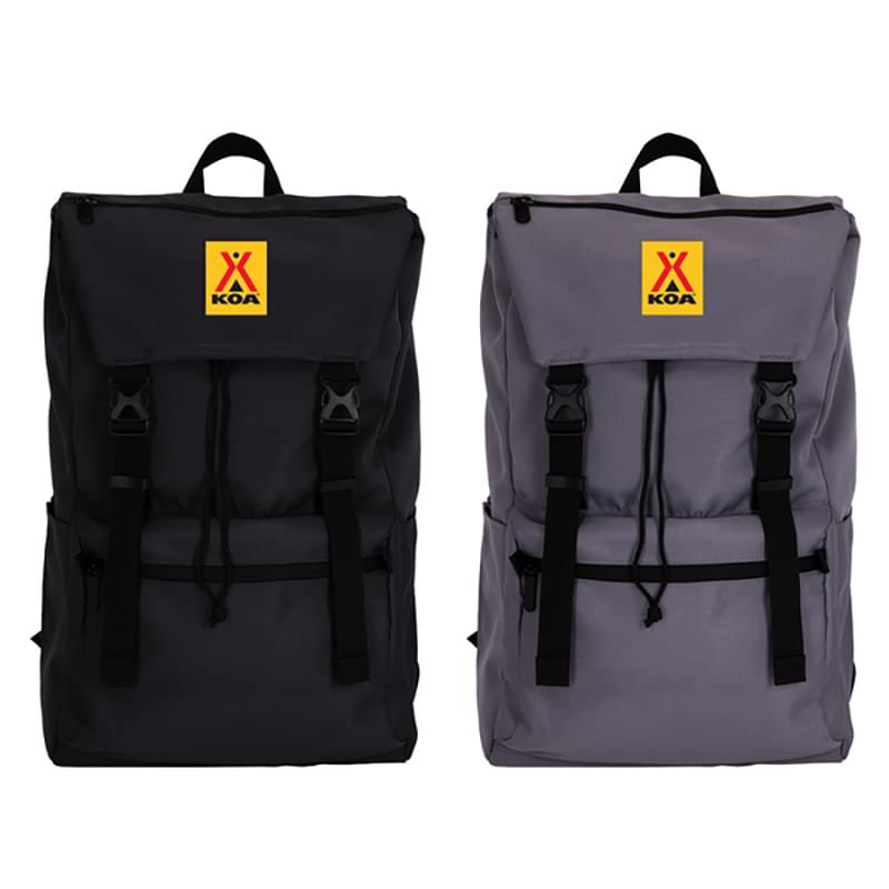 The Nomad Buckle Backpack: a nomadic marvel with a 600*600D/PU RPET body and 210D/PU 100% polyester grey lining. Its pull cord top opening and padded laptop sleeve (fits 17 laptops) ensure easy access and secure storage. The flap over, secured with buckles and webbing, houses a zipper front pocket. Additional features include a front zip pouch, two side water bottle pockets, adjustable padded straps, and a trolley strap. Elevate your style while embracing friendly fashion with this versatile, compact backpack.