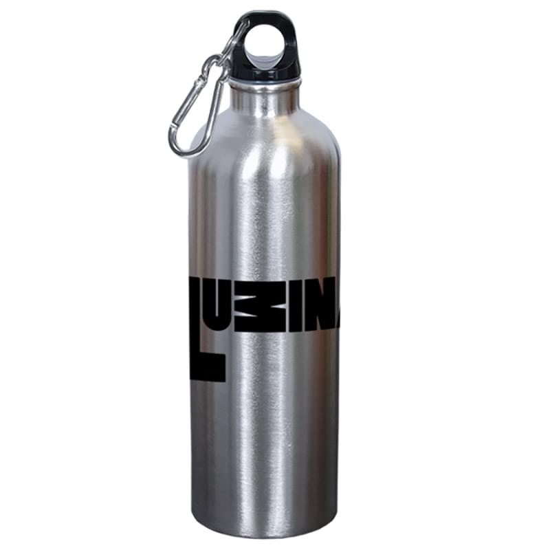 18/8 stainless steel with 0.4mm single wall|Holds up to 750 ml (25 oz.)|Safe alternative to plastic for your health and the environment|Black plastic screw cap with carabiner|BPA free (Bisphenol A) and FDA Compliant|Keep plastic bottles out of our landfills