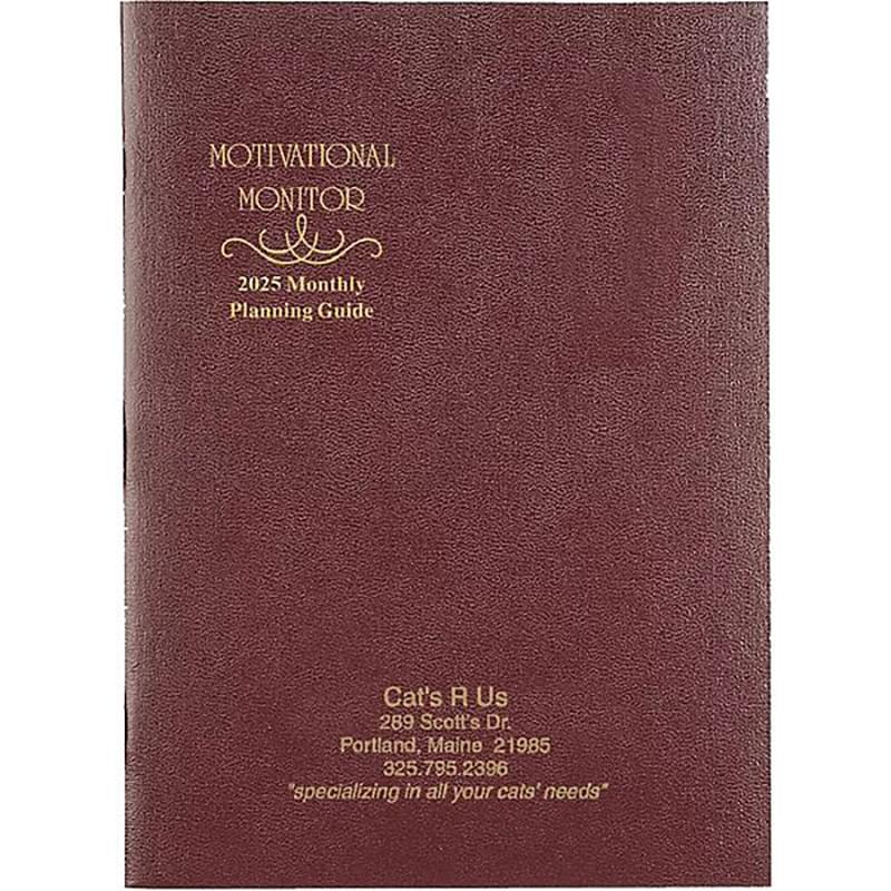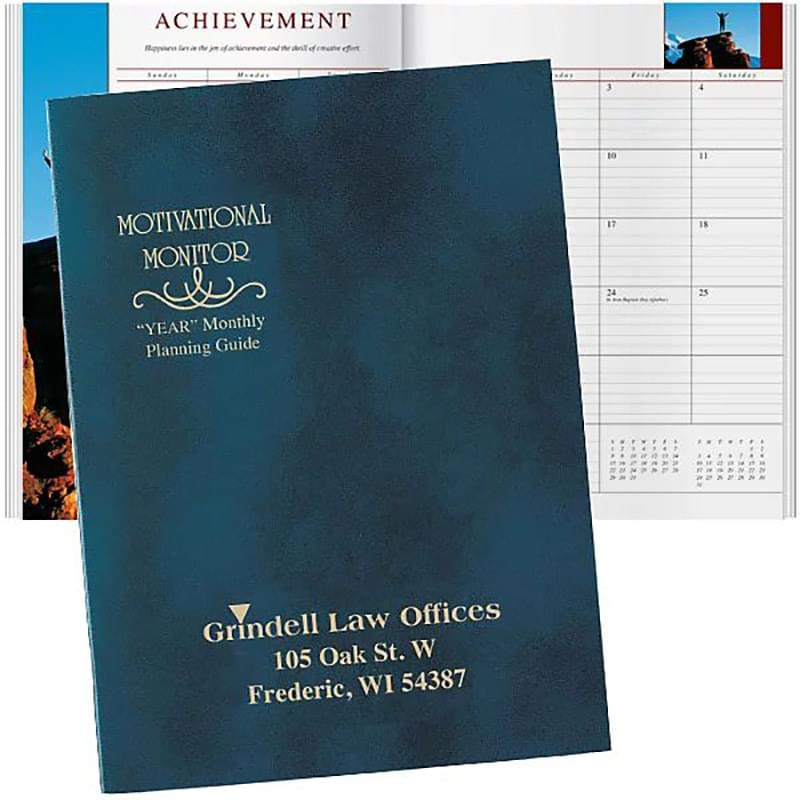 This planner has saddle stitching and monthly full color pictures. Planner name and year are pre-stamped in gold.