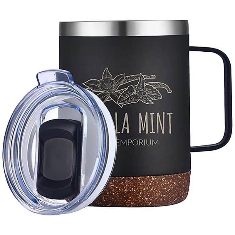 • 12 oz. double-wall powder coated stainless steel with faux cork base to protect surfaces from heat and scratches