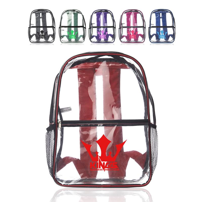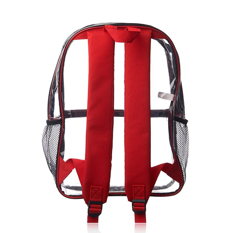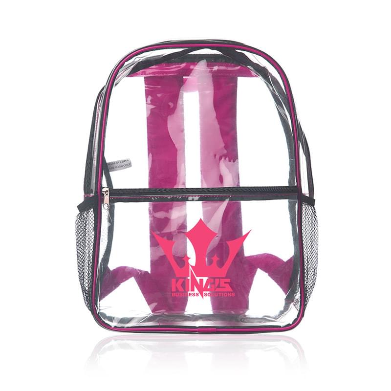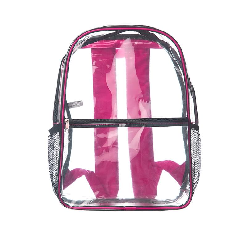 Designed with plenty of storage space for books, travel needs and more, this multifunctional clear backpack measures 11" x 15.50" x 5" and is made of PVC material. Features include padded adjustable straps, a top handle for easy grabbing, two side mesh pockets for water bottles, dual zippered compartments and a front pocket ideal for snacks, pencils and other accessories. The clear design makes it simple to find anything you're looking for!