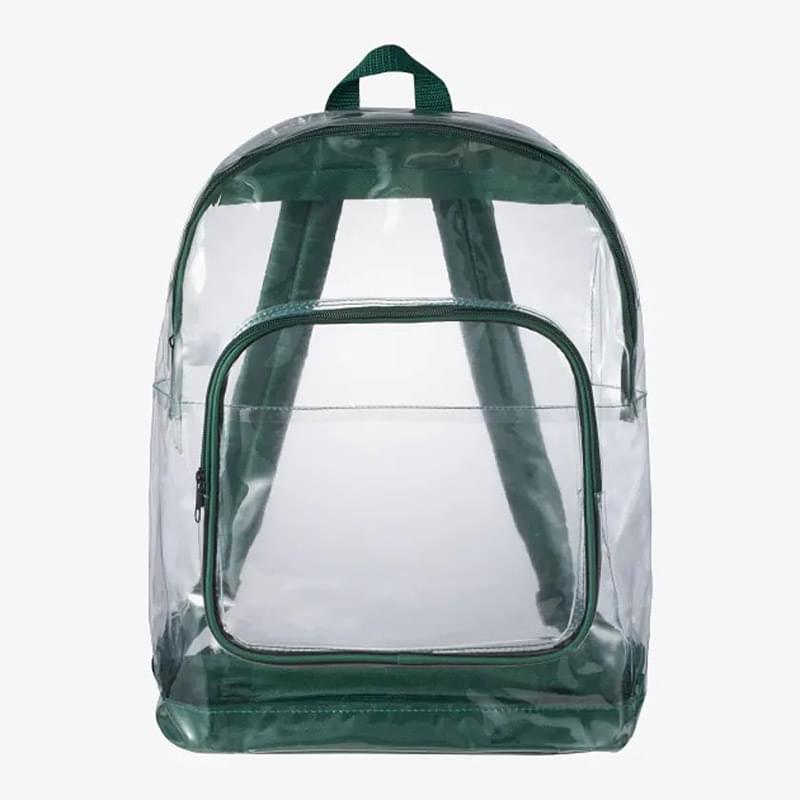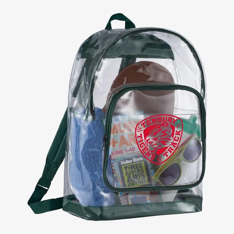 The Rally Clear Backpack has transparent material that makes this bag perfect for stadium, event, workplace and other safety purposes. The large zippered main compartment features a reinforced 210d bottom and a large gusseted zippered front pocket with a protective flap. Adjustable padded shoulder straps and a top carry handle make carrying convenient.