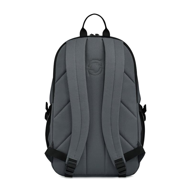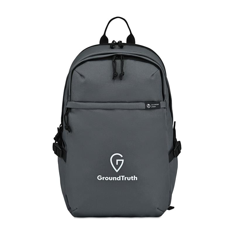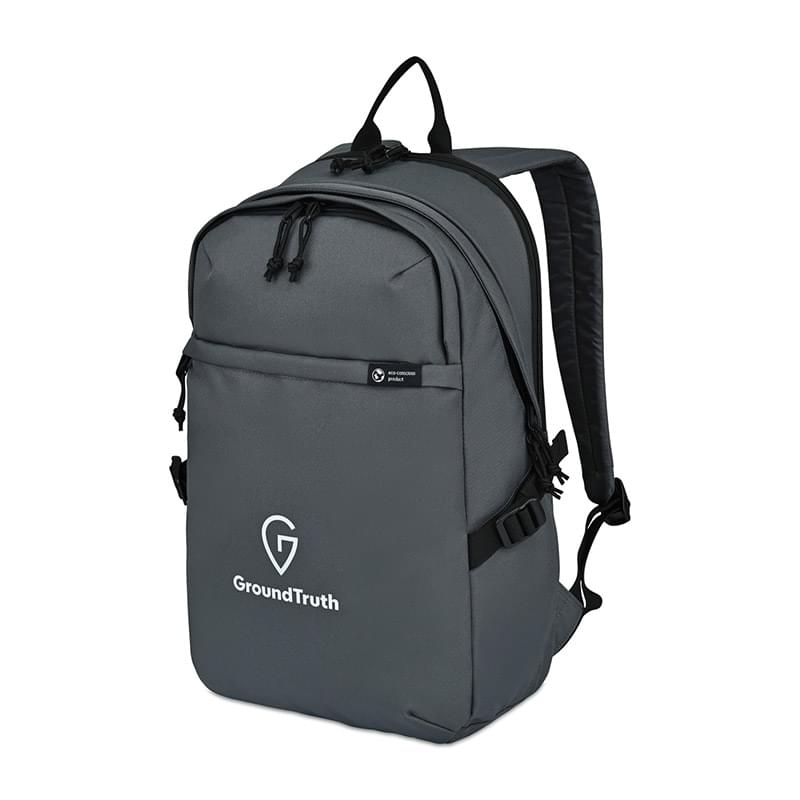 A modern and sustainable update to a classic computer backpack using recycled fabric and webbing made from plastic bottles. Top dual zippered pocket for storing accessories. Front zippered pocket with key fob clip. Dual side water bottle pockets with compression straps. Rear padded, dual zippered laptop compartment (holds up to a 15" laptop). Zippered main compartment includes interior pockets for organization. Top grab handle. Padded back panel. Padded, adjustable shoulder straps.
