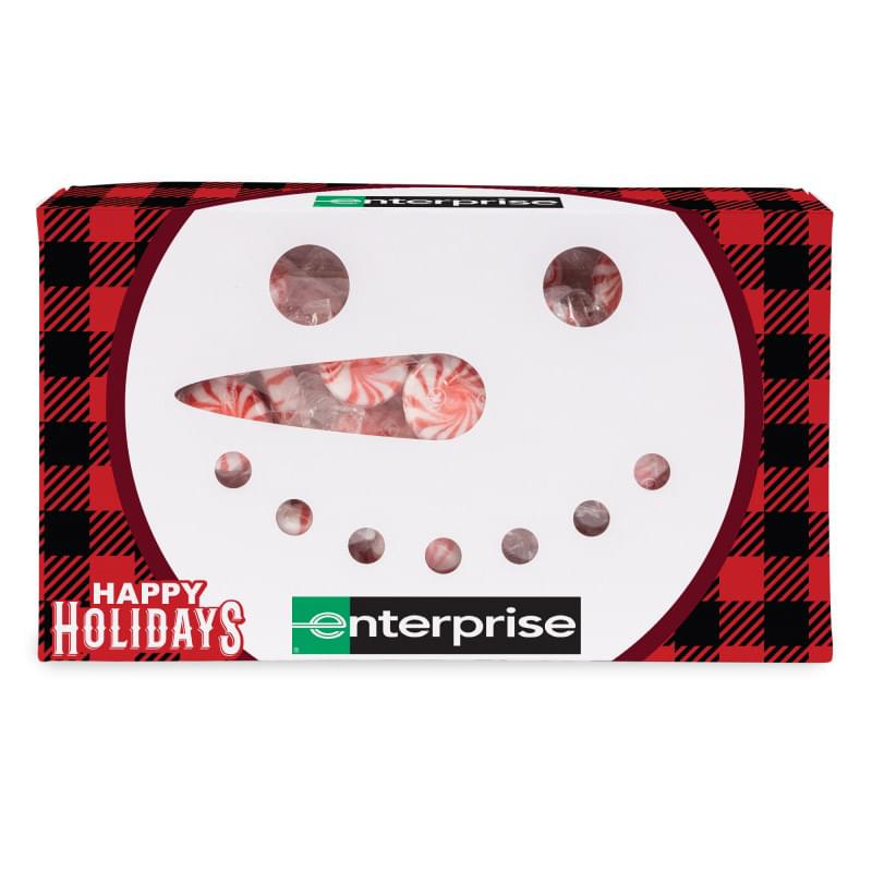 Full color die cut box features adorable snowman design. Add your logo to our stock design or fully customize box. Comes filled with delicious starlight mints. "Snow" your appreciation this holiday season!