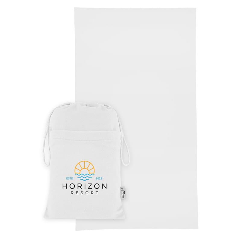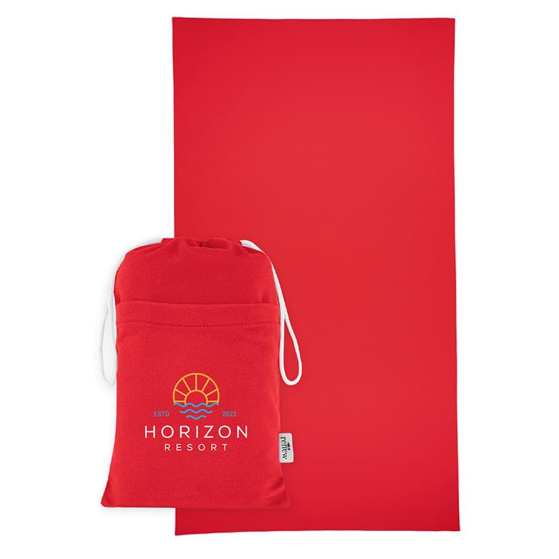rPET Towel With Matching rPET Drawstring Pouch | Made From Post Consumer Recycled Materials | Recycled Polyester (rPET) is Obtained By Melting Down Existing Plastic Bottles And Other Material Sources To Create New Polyester Fiber | Drawstrings & Label Are Not rPET | 180 GSM | Sand-Free Design Made To Keep Sand Off | Great For The Beach, Boating Or Any Outdoor Water Activity