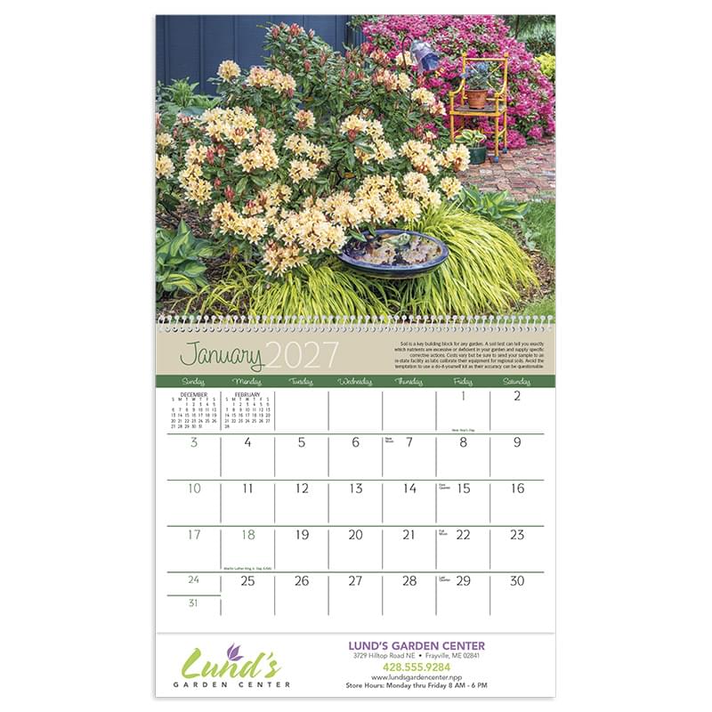 12 beautiful backyard images with a basic gardening tip each month.Add value to your calendar with an extra sheet and/or an Insights backmount for no additional costSunrise & sunset times on each date grid based on Central Time ZonePixaction Preview included on this product
