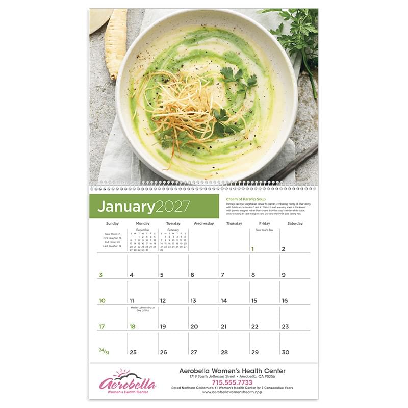Healthy eating can be delicious too with these 12 mouth-watering foods and the make-it-healthy tips with each picture.Add value to your calendar with an extra sheet and/or an Insights backmount for no additional cost12 clip-and-save recipe cards, one for each featured food, behind the Dec gridIncludes a Kitchen Reference Guide showing common cooking terms, kitchen equivalents & substitutionsPixaction Preview included on this product