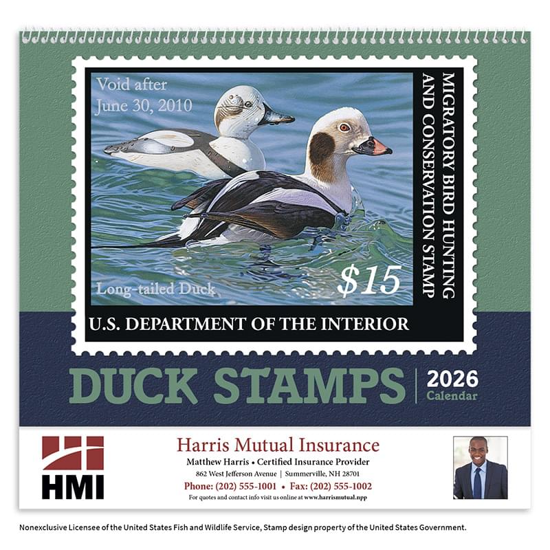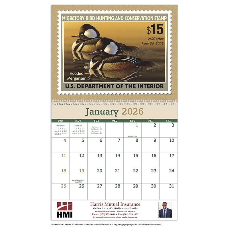 This calendar is a true collector's item featuring historical United States Department of the Interior Duck Stamps.Add value to your calendar with an extra sheet and/or an Insights backmount for no additional costPixaction Preview included on this product