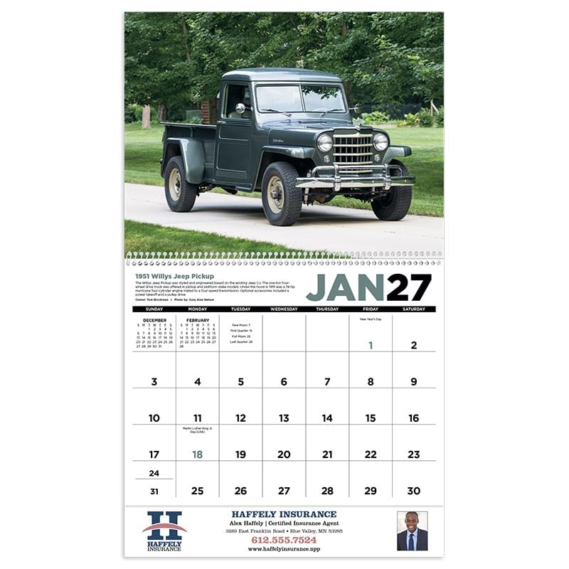 Classy and powerful antique trucks get the job done with style in this calendar.Add value to your calendar with an extra sheet and/or an Insights backmount for no additional costIncludes information about each featured truckPixaction Preview included on this product