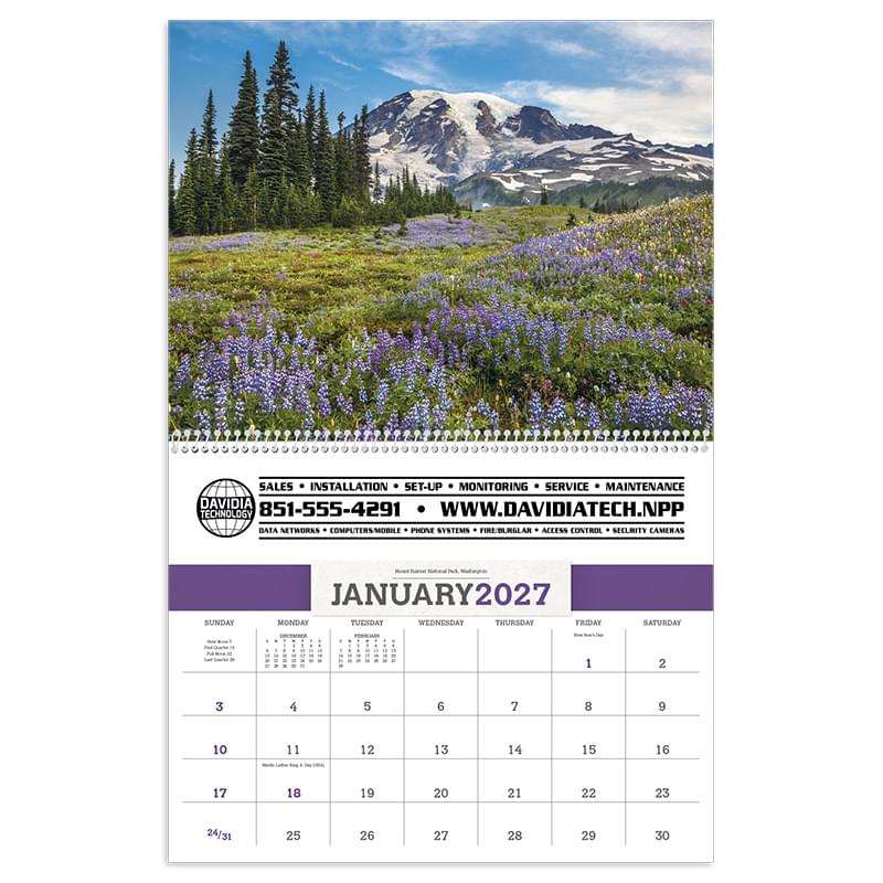 Dazzling scenery brings the outdoor world directly to a home or office. With colorful photographs, this calendar captures the senses. This theme is perfect for any business.