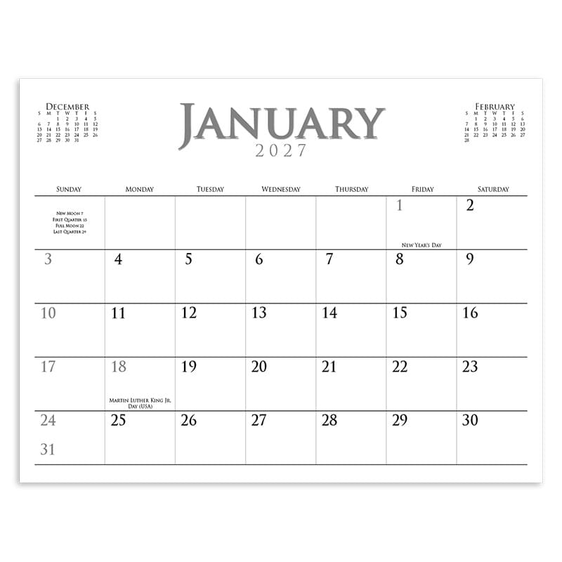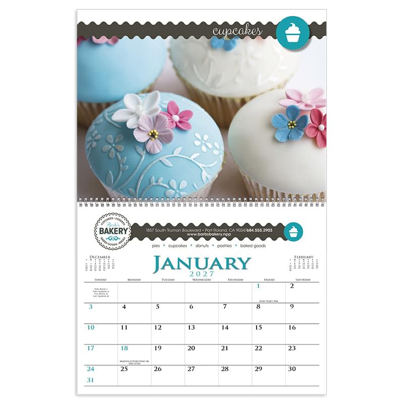 A 12-month spiral bound appointment calendar featuring 13 custom images. The ad imprint shows every month. The calendar grid can start with any month. Grid available in English only.Low quantities perfect for smaller advertisersPricing is based on digital images and copy suppliedEconomical advertising that lasts for 365 daysPerfect "Event" calendarFast Turn TimesFour-color process printing on every productAvailable in English onlyCustomers choice on 2nd color option for grid.Premium paper throughout CONTENTS INCLUDES Includes: This custom calendar uses 13 full-color images. Two grid options and customers choice for 2nd color option on grid. IMPRINT Digital Every Month Center Ad Size: 9-1/2”w x 1-3/8”h, 4 colors included, Standard. Digital Top, Picture Area Text Margin: 10-1/16”w x 7-5/8”h;Trim Size: 10-7/8”w x 8-3/8”h;Bleed Size: 11-1/16”w x 8-5/8”h, 4 colors included, Standard. PRODUCT DIMENSIONS/SPECIFICATIONS Product Height: 8.375" Product Width: 10.875" Height Open: 16.75“ Height Closed: 8.375“ PRODUCT MATERIALS 80# gloss cover