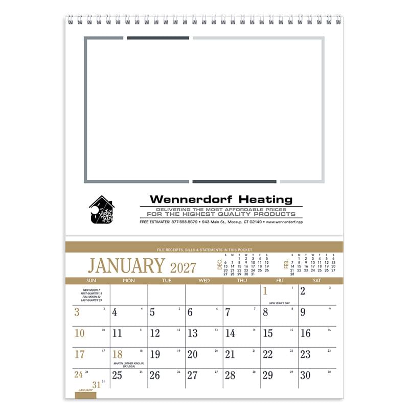 This high-quality pocket calendar comes at a great price, and features recipes and a convenient storage pocket each month.Front & back of grid prints in 465 brownIncludes recipes and home hintsGrid include Julian dates
