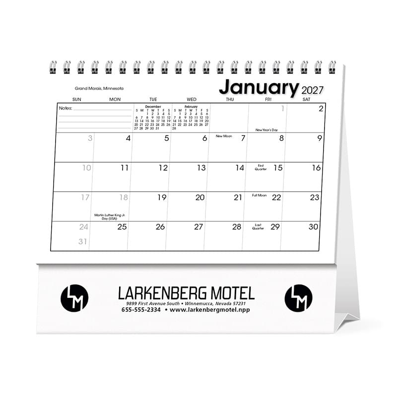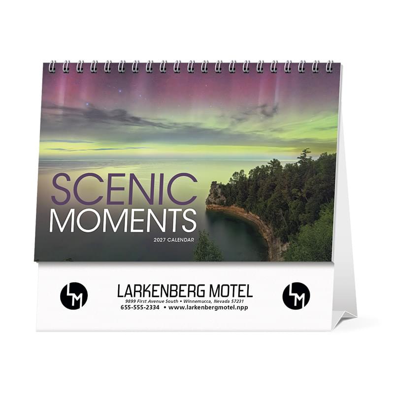 Scenes from North America grace the pages of this large desk calendar.Same ad message prints on both sides of tent mount