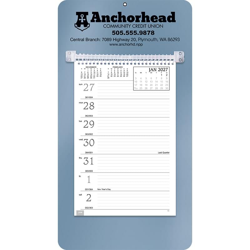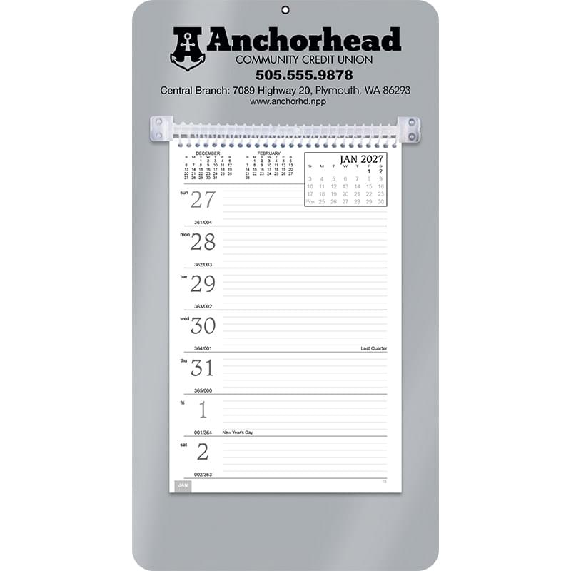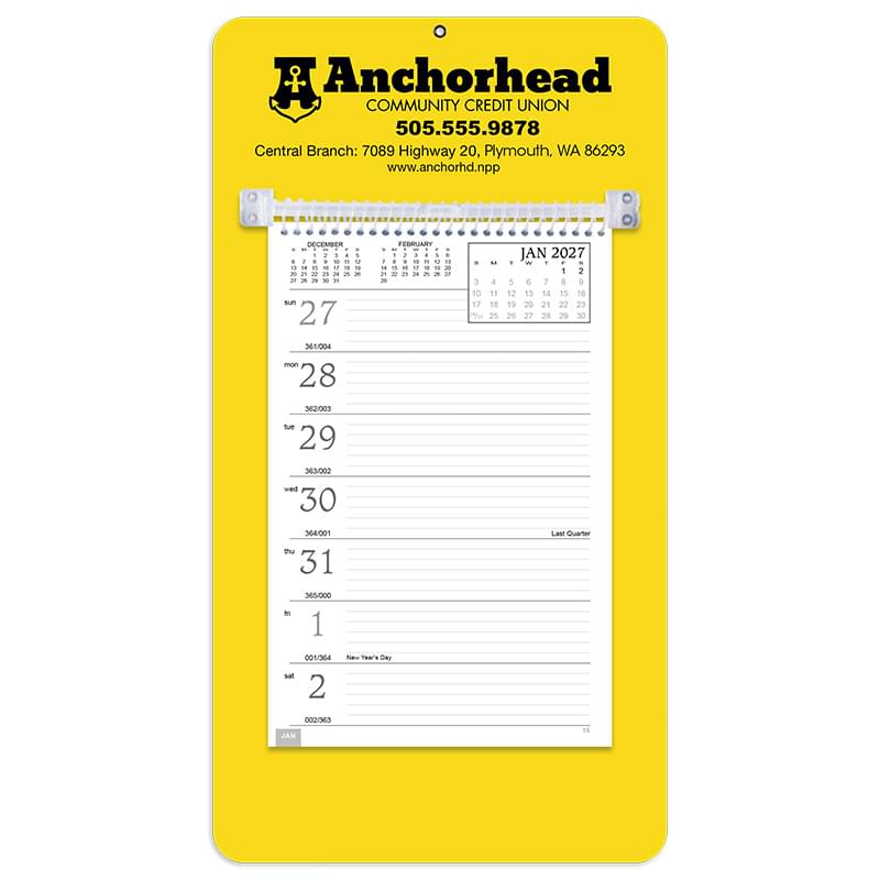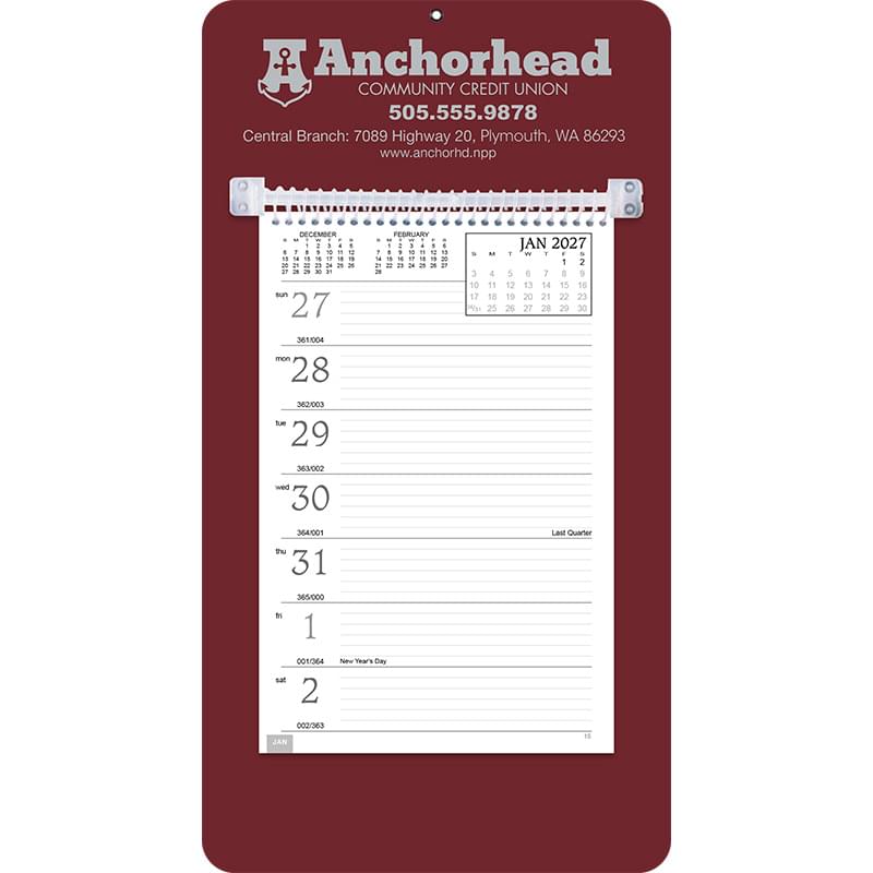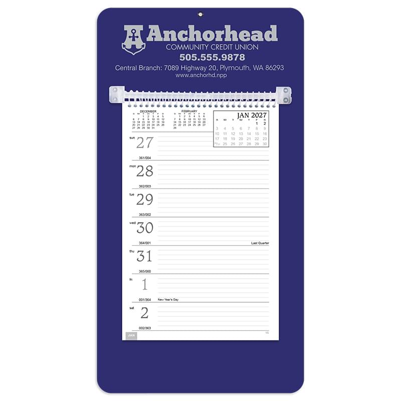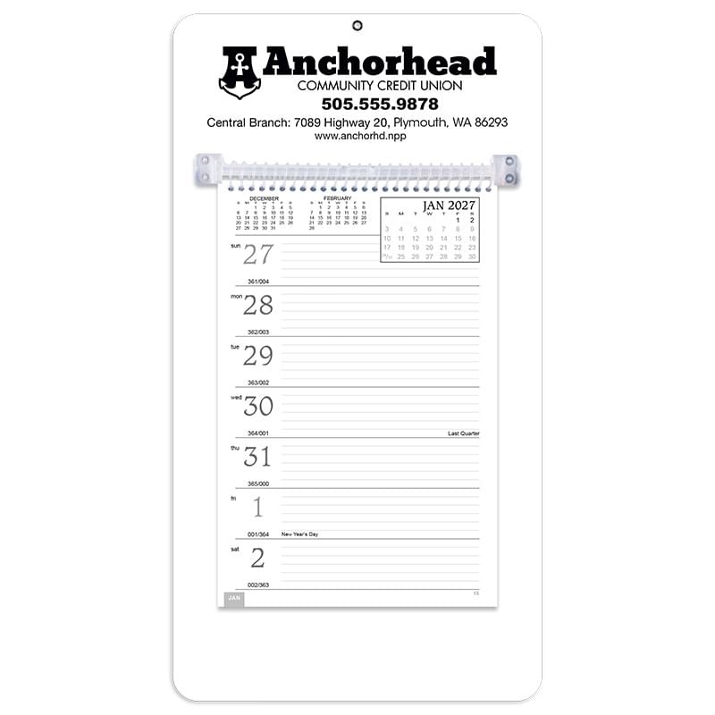 This handy model has a sturdy mount board with a hanging hole, along with ruled daily memo space. View a full week with insets of before, current and after months on every page.
