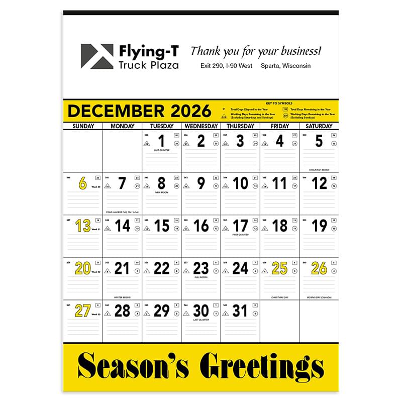 This giant planner is used in most industries. Date blocks contain faintly ruled lines along with symbols denoting the days elapsed and remaining in the year, work days remaining without Sunday & Saturday and work days remaining without Sunday.December top sheet included at no extra chargeGrid yellow matches 109 yellowGrid includes Julian dates and work days remaining in the year
