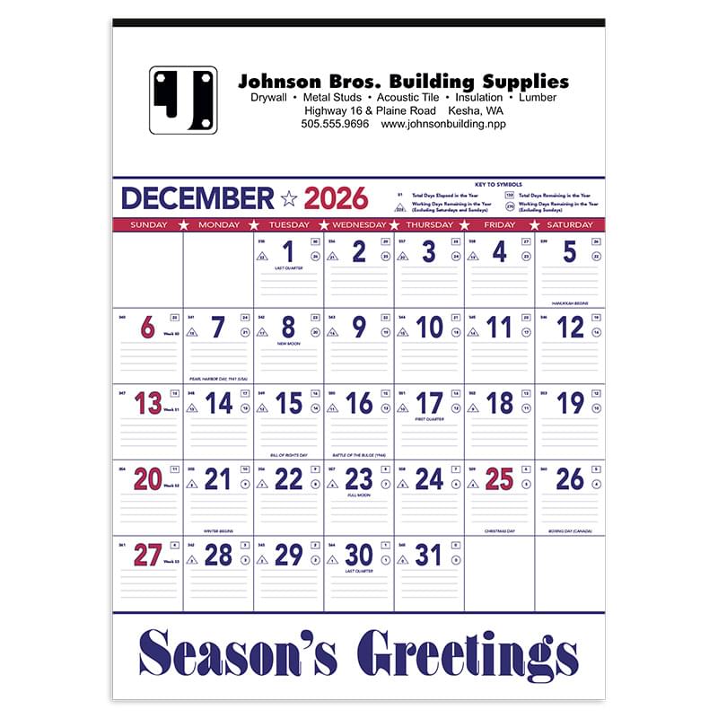 This giant planner now comes in a patriotic design. Date blocks contain faintly ruled lines along with symbols denoting the days elapsed and remaining in the year, work days remaining without Sunday & Saturday and work days remaining without Sunday.December top sheet included at no extra chargeGrid red & blue matches 193 red & 281 blueGrid includes Julian dates and work days remaining in the year