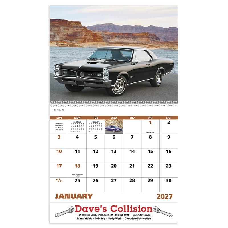 This calendar shows off muscle cars that deliver your message fast!13-Month calendar with December month printed on backmountGloss Paper Stock with UV Coated CoverHigh-quality Imagery