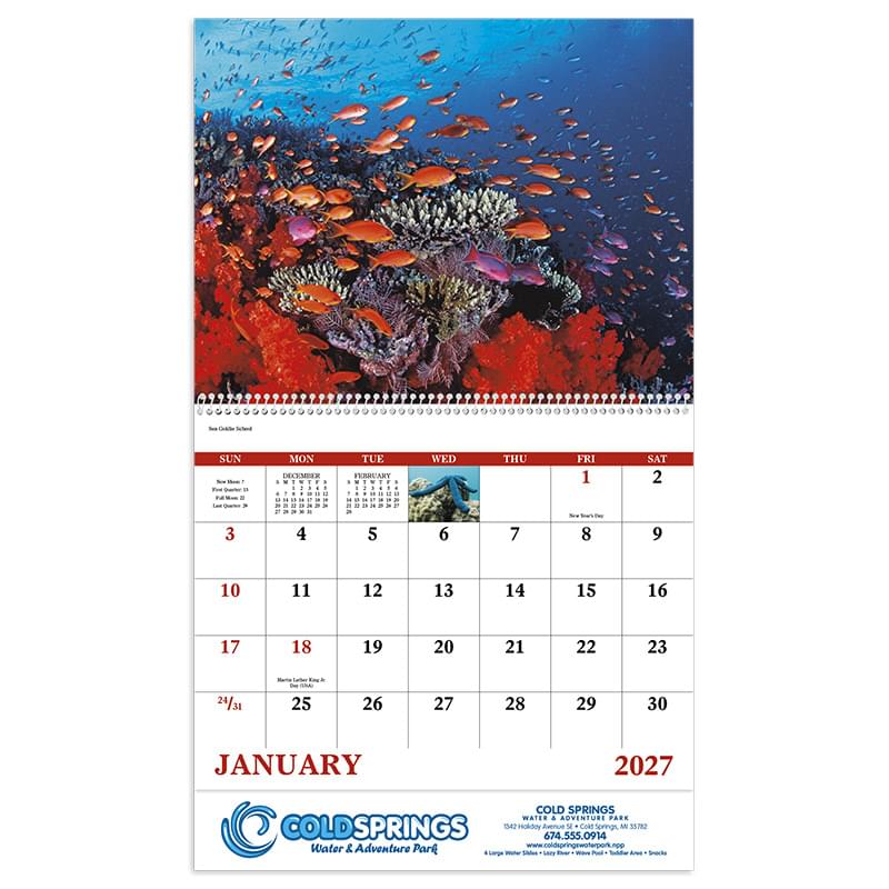Use the spectacular sea life to deliver your message to your audiences.13-Month calendar with December month printed on backmountGloss Paper Stock with UV Coated CoverHigh-quality Imagery