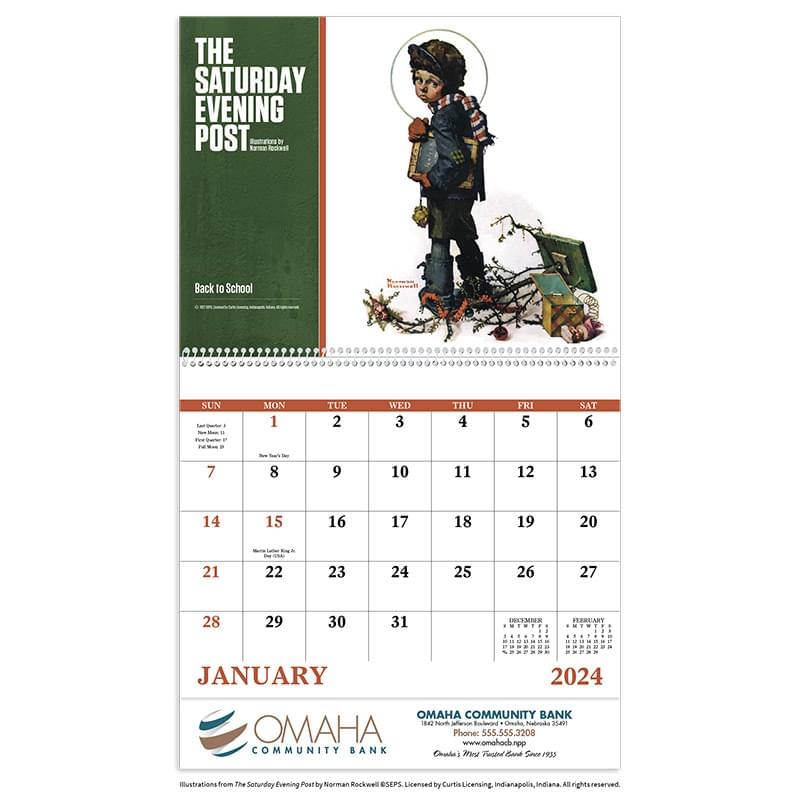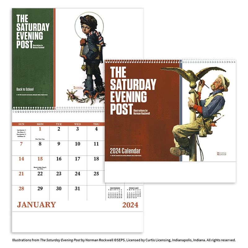 This calendar features Saturday Evening post covers by Norman Rockwell.13-Month calendar with December month printed on backmountGloss Paper Stock with UV Coated CoverHigh-quality Imagery