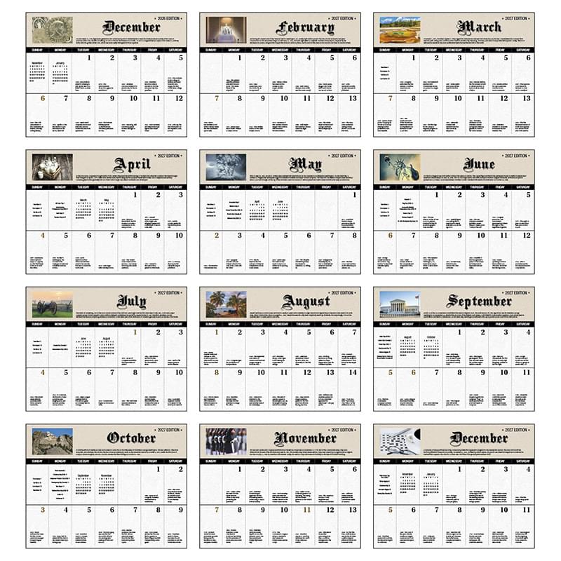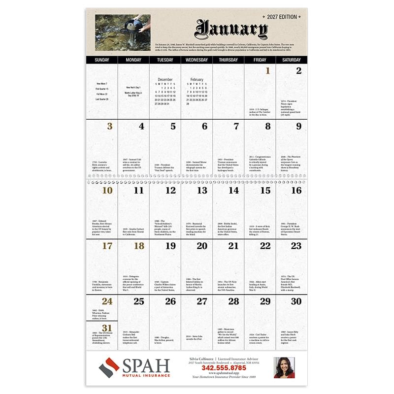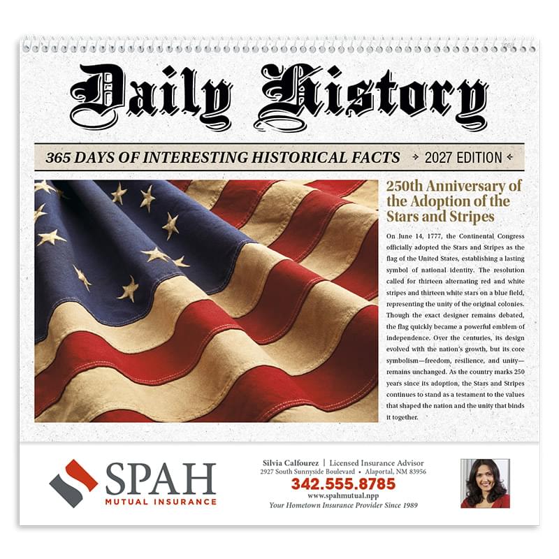 Fascinating facts bring American history to life. 13-Month calendar with December month printed on back-mount Gloss paper stock with UV coated cover High-quality Imagery