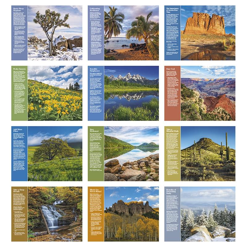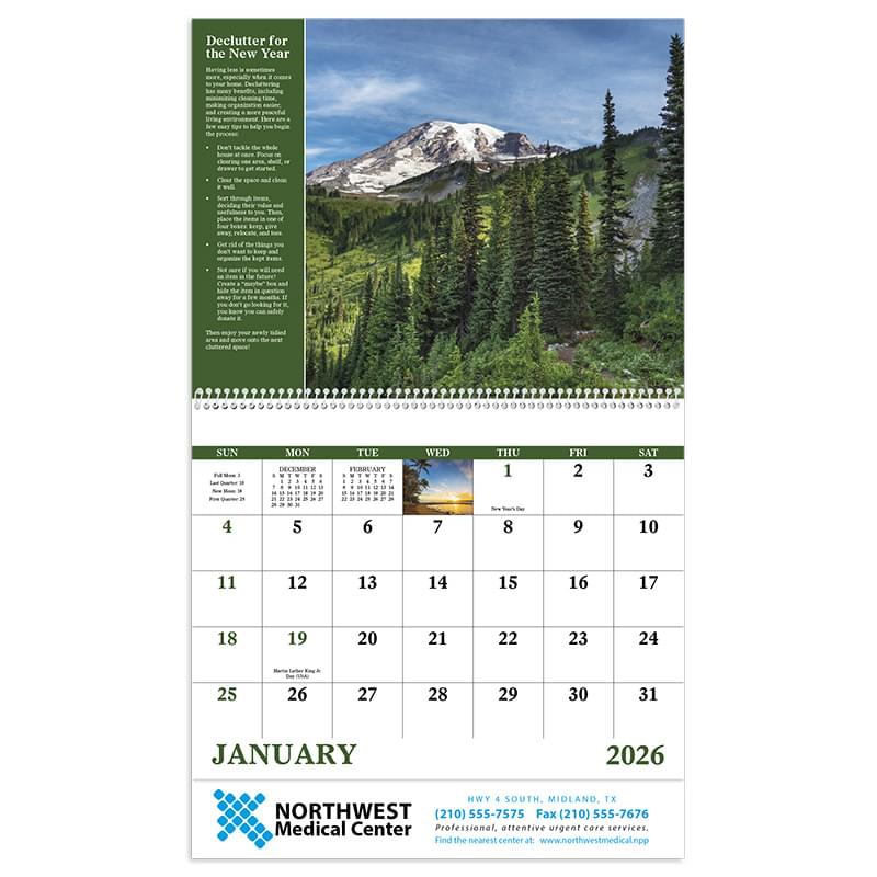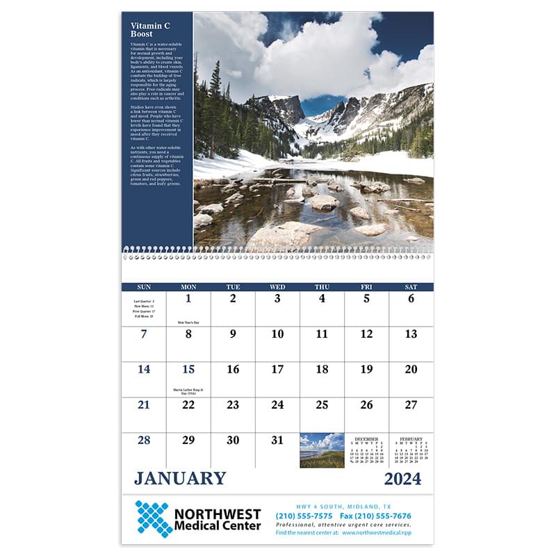 This calendar is great because it features majestic natural wonders plus healthy living tips.13-Month calendar with December month printed on backmountGloss Paper Stock with UV Coated CoverHigh-quality Imagery