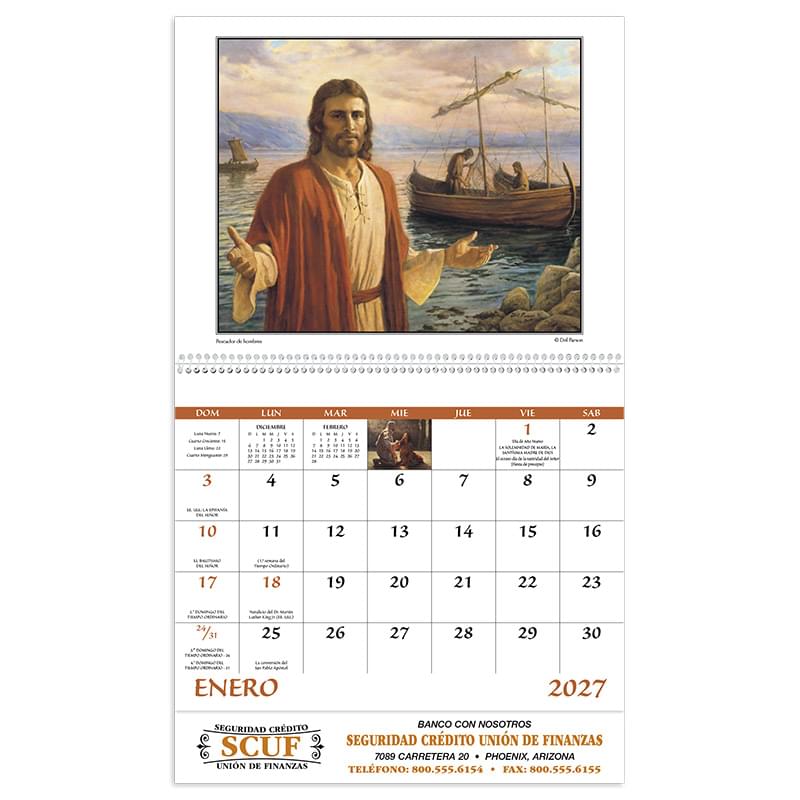 This calendar is great for advertisers with Spanish speaking customers. The grid includes Catholic observances.13-month calendar beginning DecemberGloss Paper Stock with UV Coated CoverHigh-quality ImagerySpanish grid