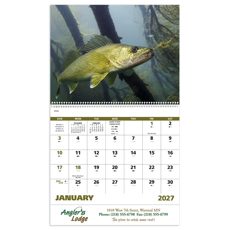 Catch your customers' attention every month with this fun fish calendar!13-Month calendar with December month printed on backmountGloss Paper Stock with UV Coated CoverHigh-quality Imagery