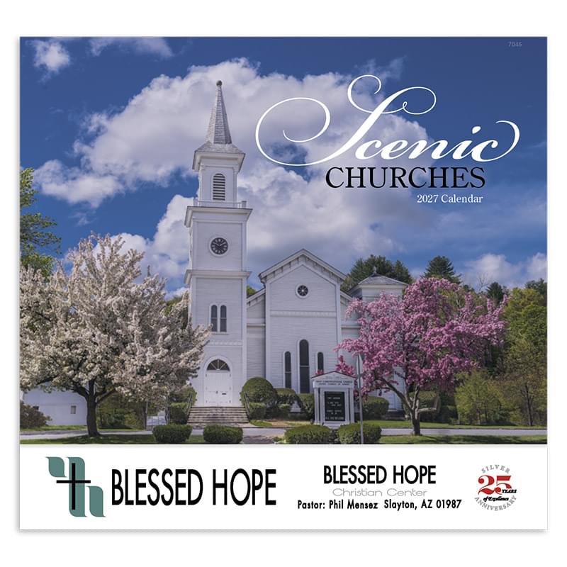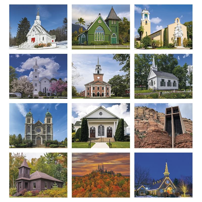 This calendar features images of charming country churches.
