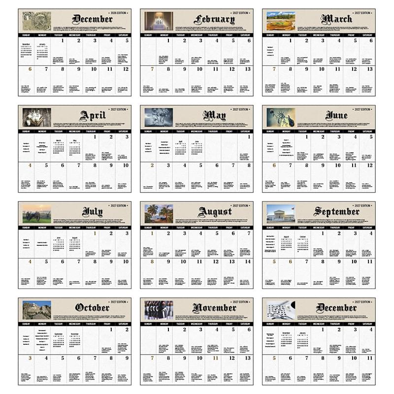 Fascinating facts bring American history to life.13-Month calendar with December month printed on backmountGloss paper stock with UV coated coverHigh-quality Imagery