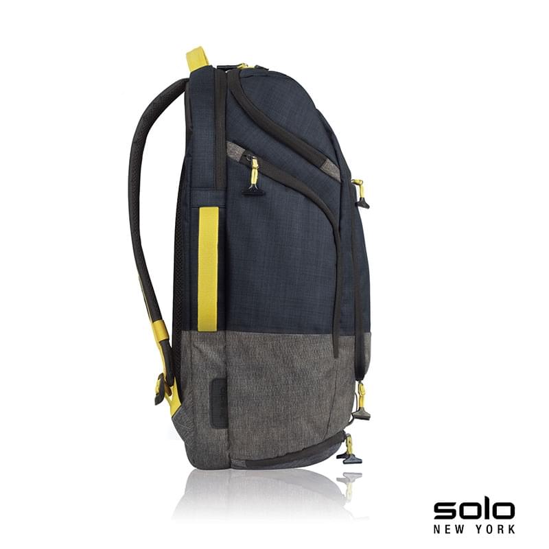 The two-tone black and navy Everyday Max backpack from Solo NY is sustainably constructed from recycled materials. Features include a padded compartment that will hold a 17.3" laptop, tablet pocket, padded phone/media player pocket, carry handles on four sides, T-bar zip pulls, separate shoe compartment with tie-down strap and padded air mesh backpack straps with chest strap. The main compartment features top and body zippered opening and five interior zippered pockets. Side zippered pockets fit most water bottles. Manufacturer provides 5 year limited warranty.
