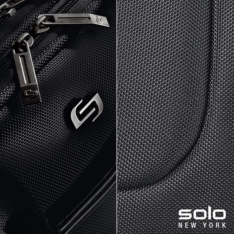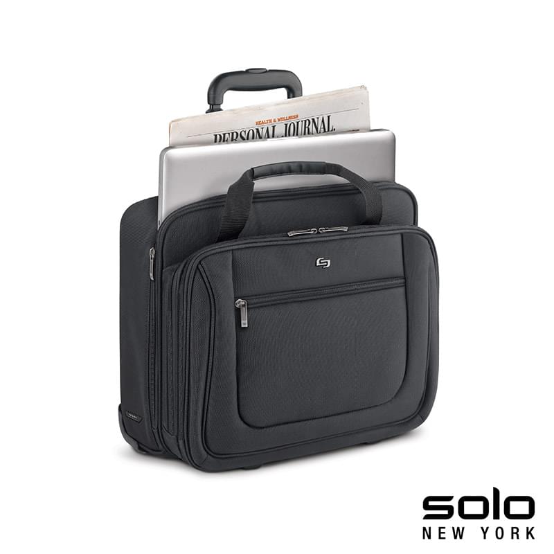 The fully-lined Solo New York Bryant Rolling Case features sleek lines and smart details ideal for the office and business travel. This Midtown collection bag has a zippered compartment with a file divider and padded pocket that will hold 15.6" laptops. The front zip-down pocket has organizers and pen loops. It also features padded carry handles, leather luggage tag, and a telescoping trolley handle that extends to 41 1/2".
