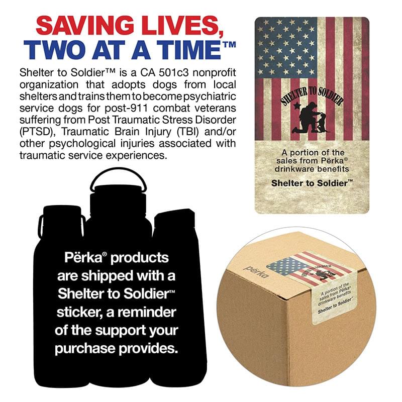 The Perka® Dresden Water Bottle is a perfect drinkware piece that suits your hydration needs and your natural sensibilities. It has a double wall stainless steel vacuum insulated construction that keeps drinks hot for 12 hours and cold for 24 hours, and a natural bamboo lid and base. The bottle's sleek profile is easy to hold and will fit in most car cup holders and it's easy to bring with you using its swing carry handle. Leave behind plastic water bottles and switch to a reusable insulated water bottle that is FDA compliant and BPA Free. A portion of all proceeds is donated to Shelter to Soldier™, a non-profit organization that rescues dogs to train as service animals for veterans in need.