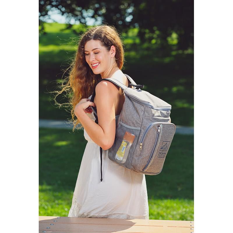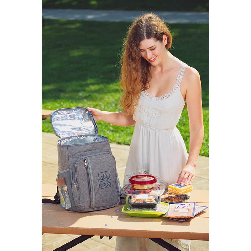 - Heathered 600D water-resistant polyester cooler backpack - Large zippered, waterproof PEVA-lined main compartment - Dual side mesh pockets for water bottles or umbrella - Large zippered front pocket with inside pouch - Vertical zippered pocket on front