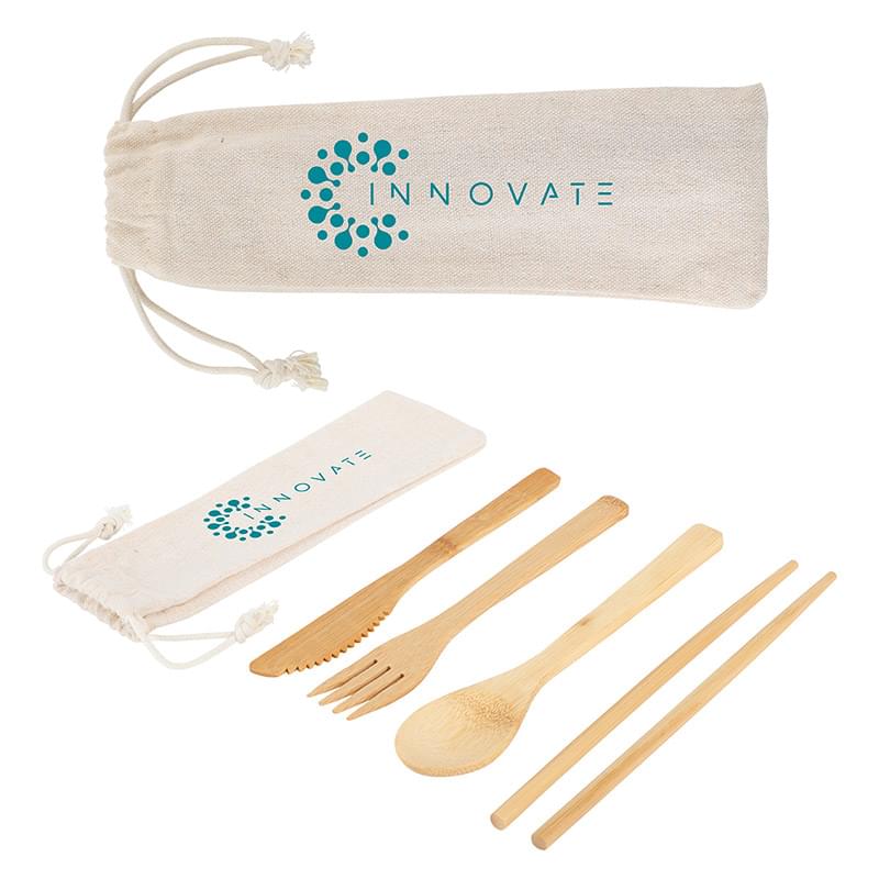 - Includes a reusable Bamboo knife, spoon, fork, chopsticks, straw, and a straw cleaning brush - Comes Packaged in a cotton drawstring pouch for convenient storage and portability - lightweight and Easy to carry, making it ideal for work lunches, travel, picnics, and outdoor activities - reusable design offers a hygienic alternative to Single-use disposable cutlery for everyday dining - perfect for eco-conscious lifestyles, sustainability programs, and promotional giveaways focused on reuse