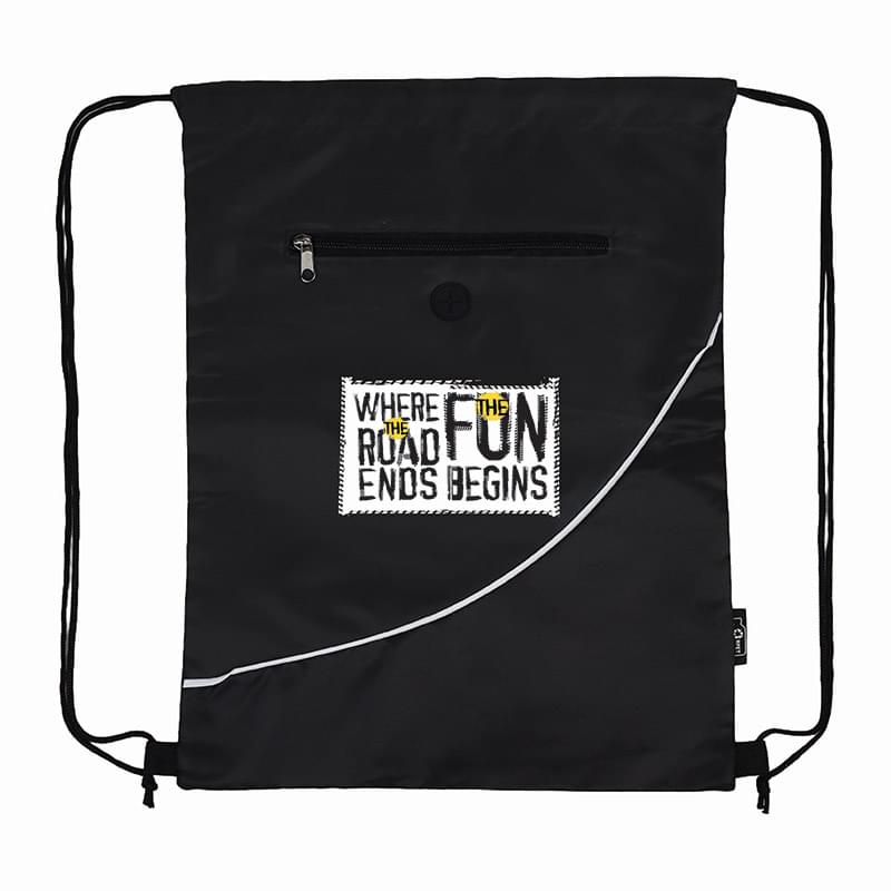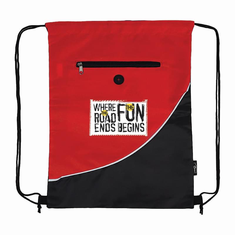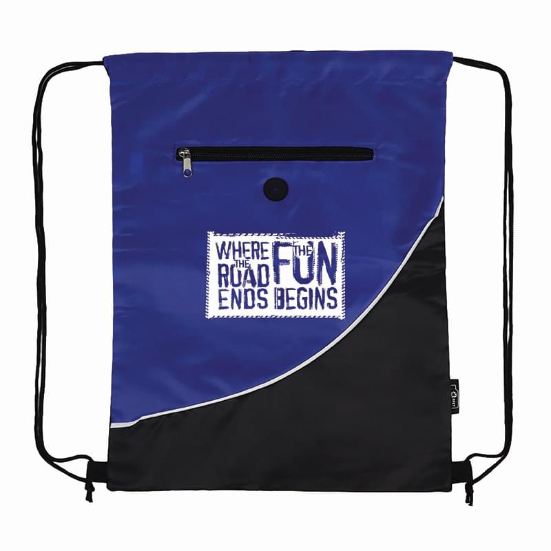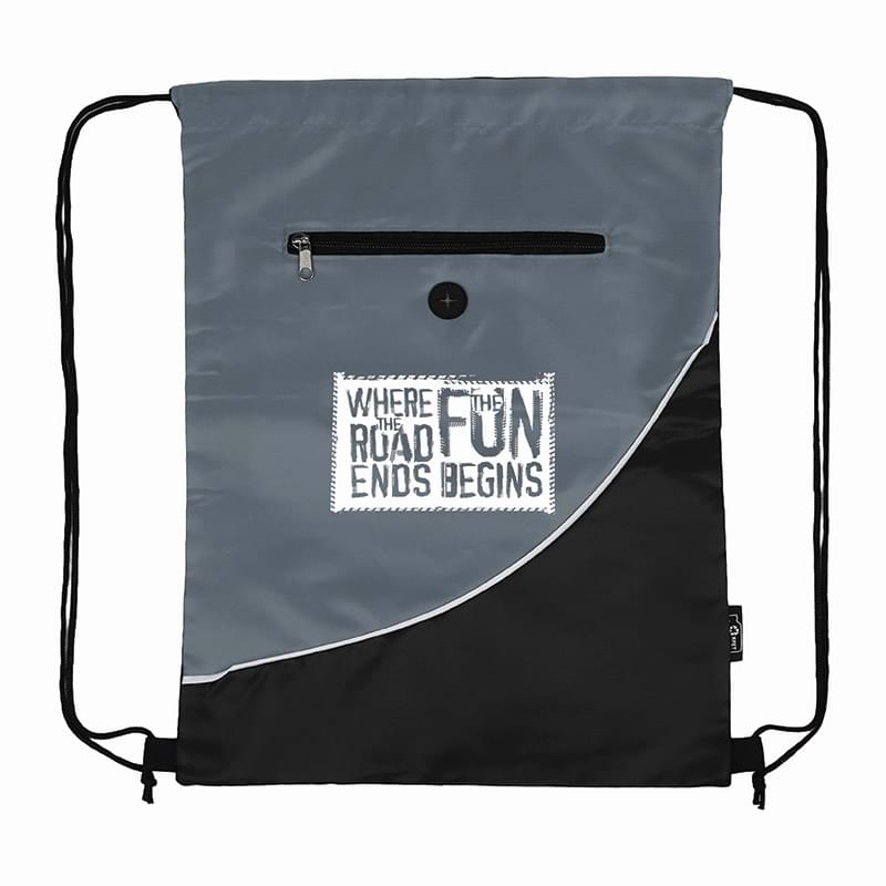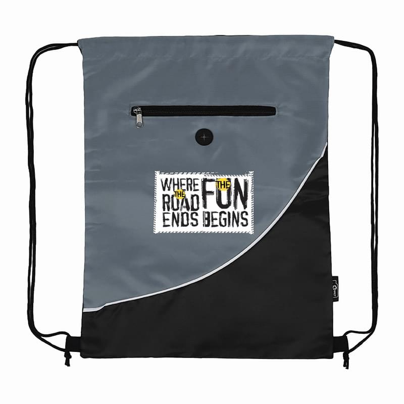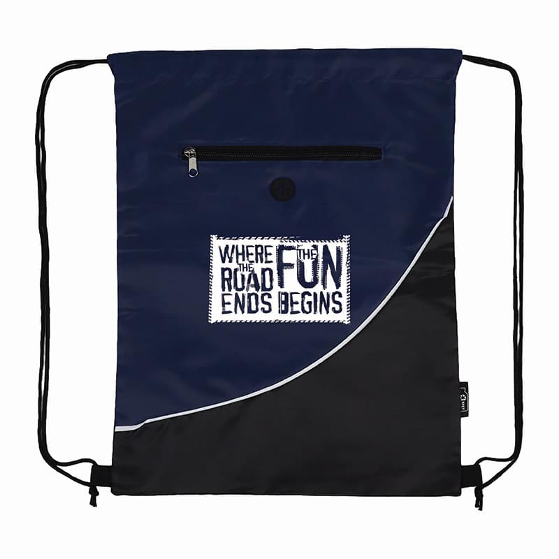This stylish drawstring bag features an attractive 2-tone design with a zippered front pocket with an earbud port. Its lightweight with a cinch rope closure for easy access and reinforced bottom corners. This eco-friendly bag is made of rPET, a material produced from recycled consumer plastics, like disposable water bottles. Additional Information: Wash instructions: Hand Spot clean and air dry only. DO NOT PUT IT INTO A WASHER, OR DRYER, OR USE AN IRON OR BLEACH. Spot clean only.