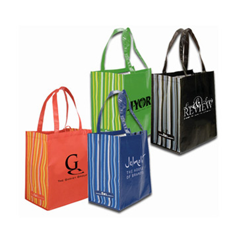 Rpet Striped Tote Bag 125 gsm, made from recycled post consumer PET Matte Lamination which is tear resistant and water repellent Reinforced 20" handles Hanging loop Maximum weight recommendation: 20 lbs.